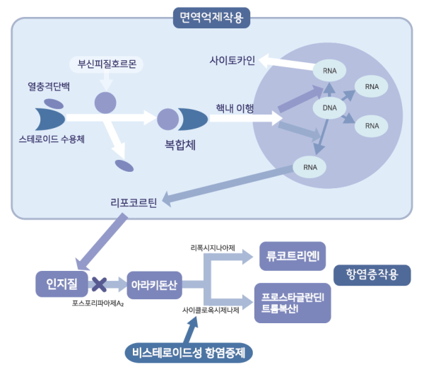 염증을 유발하는 유전 단백(NF-κB 등)의 발현으로 PLA2라는 효소가 세포막의 인지질을 아라키돈산으로 분해하고, COX라는 효소는 아라키돈산을 프로스타글란딘으로 분해한다. 통증유발물질을 차단하는 방법 중 가장 핵심인 항염제는 스테로이드 소염제와 비스테로이드 소염제(NSAIDs)로 나뉜다. 비스테로이드성 소염제는 COX의 작용을 억제하여 소염진통 효과를 내고, 스테로이드성 소염제는 리포코르틴이라는 단백질의 활성을 증가시켜 PLA2의 작용을 억제시킴으로서 통증을 가라앉히게 된다.