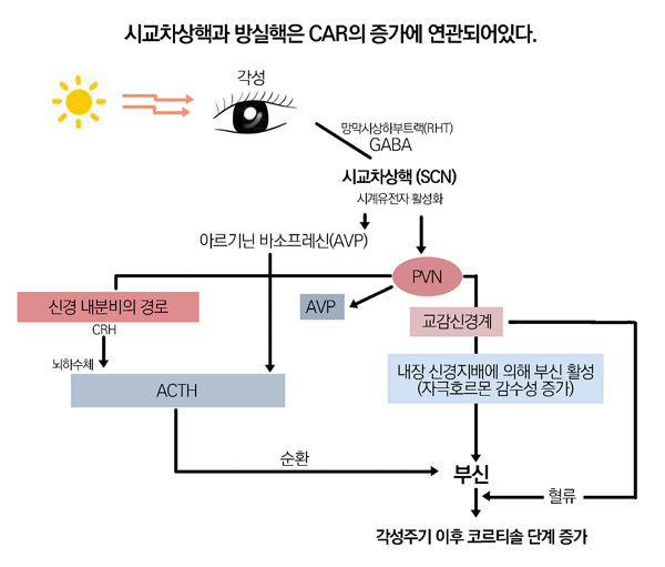 코티졸 각성 반응(CAR, Cortisol Awaken Response)이란 아침 기상 후 30-45분 사이에 코티졸이 급격히 증가하는 현상을 말한다. 눈을 통해 들어가는 빛 자극으로 시작하는 경로는 부신을 촉진하는 원동력이 된다. 코티졸 각성 반응이 잘 일어나려면, 뇌에서 일주기 시간의 변화를 감지하는 생체시계가 잘 작동되어 부신피질자극호르몬(ACTH)이 잘 분비되어야 한다. 따라서 코티졸 각성 반응은 생체리듬의 일주기 리듬을 반영하는 지표가 될 수 있다.