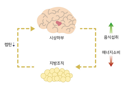 최근 15~20년 동안 식욕과 포만에 대한 신경생물학적 이해는 식욕 조절 시스템에 영향을 미치는 호르몬, 펩타이드, 그리고 모노아민 네트워크로 설명되었습니다. 그러나 이러한 내분비 조절은 완벽하지 않을 뿐더러 외부 조건(예, 비만을 촉진시키는 환경)도 내분비 조절에 영향을 미치고 있습니다. 현재 체중 조절에 대한 연구는 시상하부를 포함하는 뇌, 그리고 말초에서 에너지와 지방 저장량에 대한 신호를 주고받는 내용이 대부분인데, 그 신호 중 한 가지가 렙틴입니다. 렙틴은 지방량에 비례해 지방 세포에서 분비되는데 지방량 증가 시 시상하부에 에너지 흡수를 줄이고 소비를 늘려 지방량을 조절하는 신호를 보냅니다. 또한 렙틴의 작용 정도는 혈중 렙틴과 셋 포인트된 렙틴의 차이에 비례해서 결정되는 것으로 알려져 있습니다.